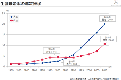 1980年以降生涯未婚率が大幅に増加。離婚率は30%を超える一方、再婚率も25%を超える時代になっています。